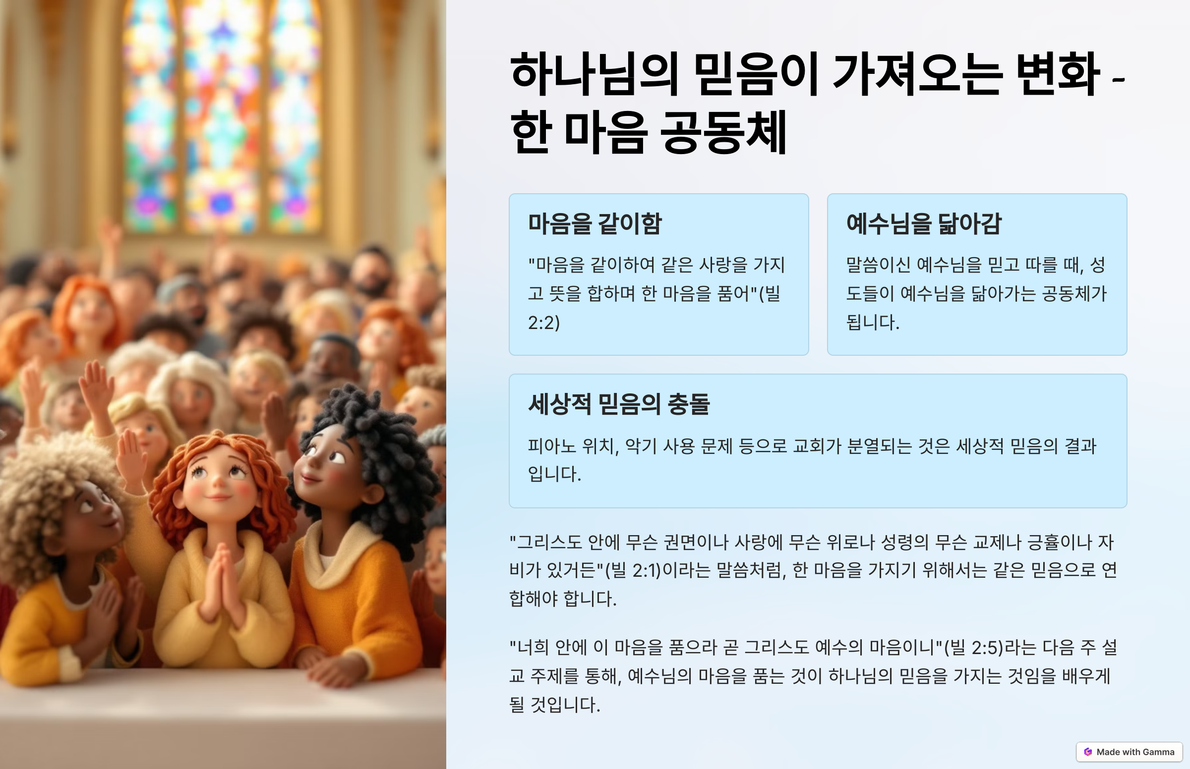 말씀을 기준으로 같은 믿음, 같은 마음을 가진 우리가 한 마음이 되는 공동체가 됩니다.