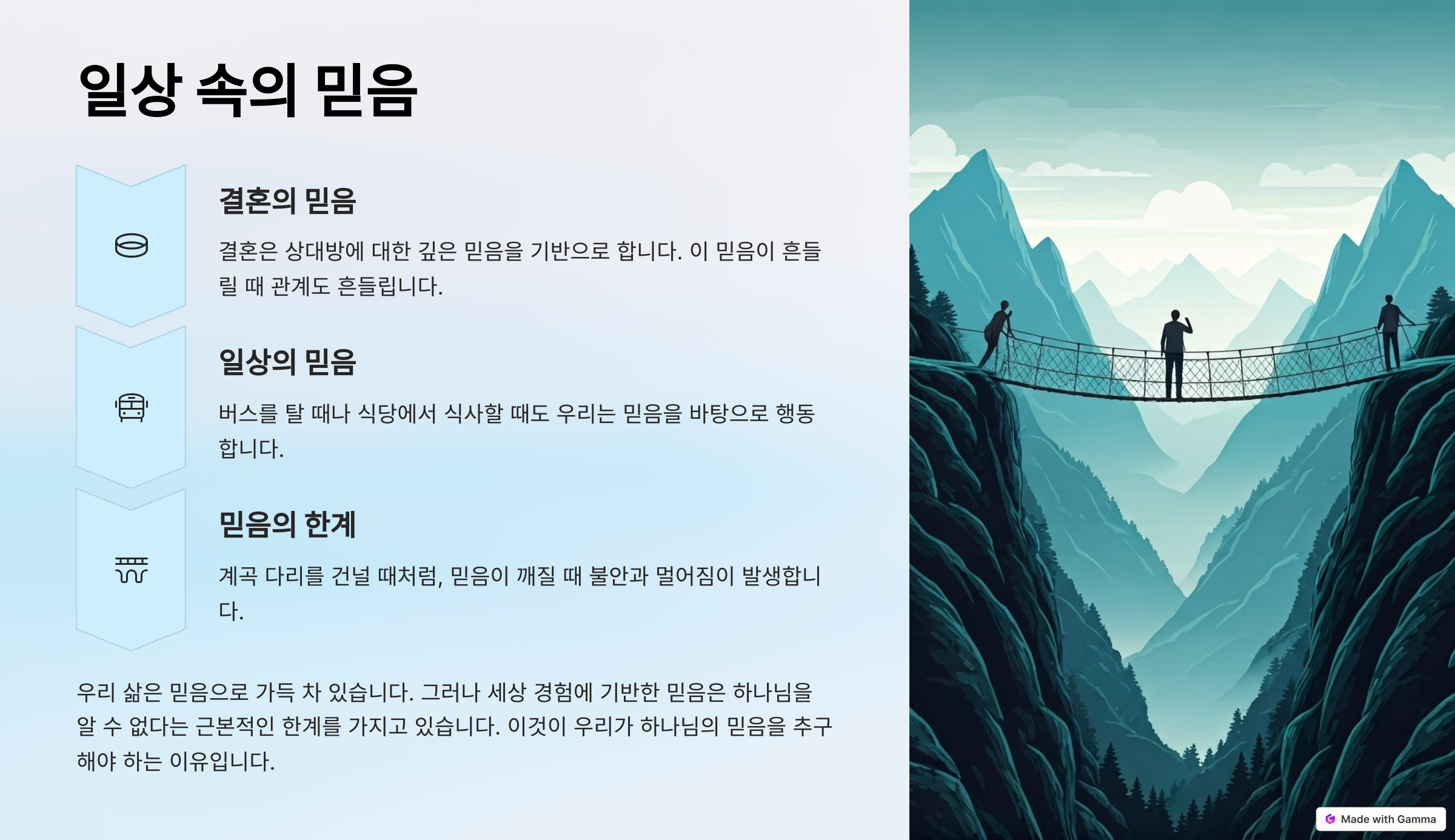 우리는 믿음을 가지고 있고, 그 믿음을 가지고 있는 만큼 사람은 살아갑니다.